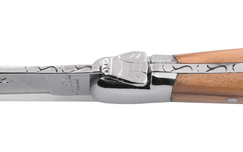 Couteau de poche Laguiole avec mèche de tire bouchon, manche en bois d'olivier, signé Jean Dubost